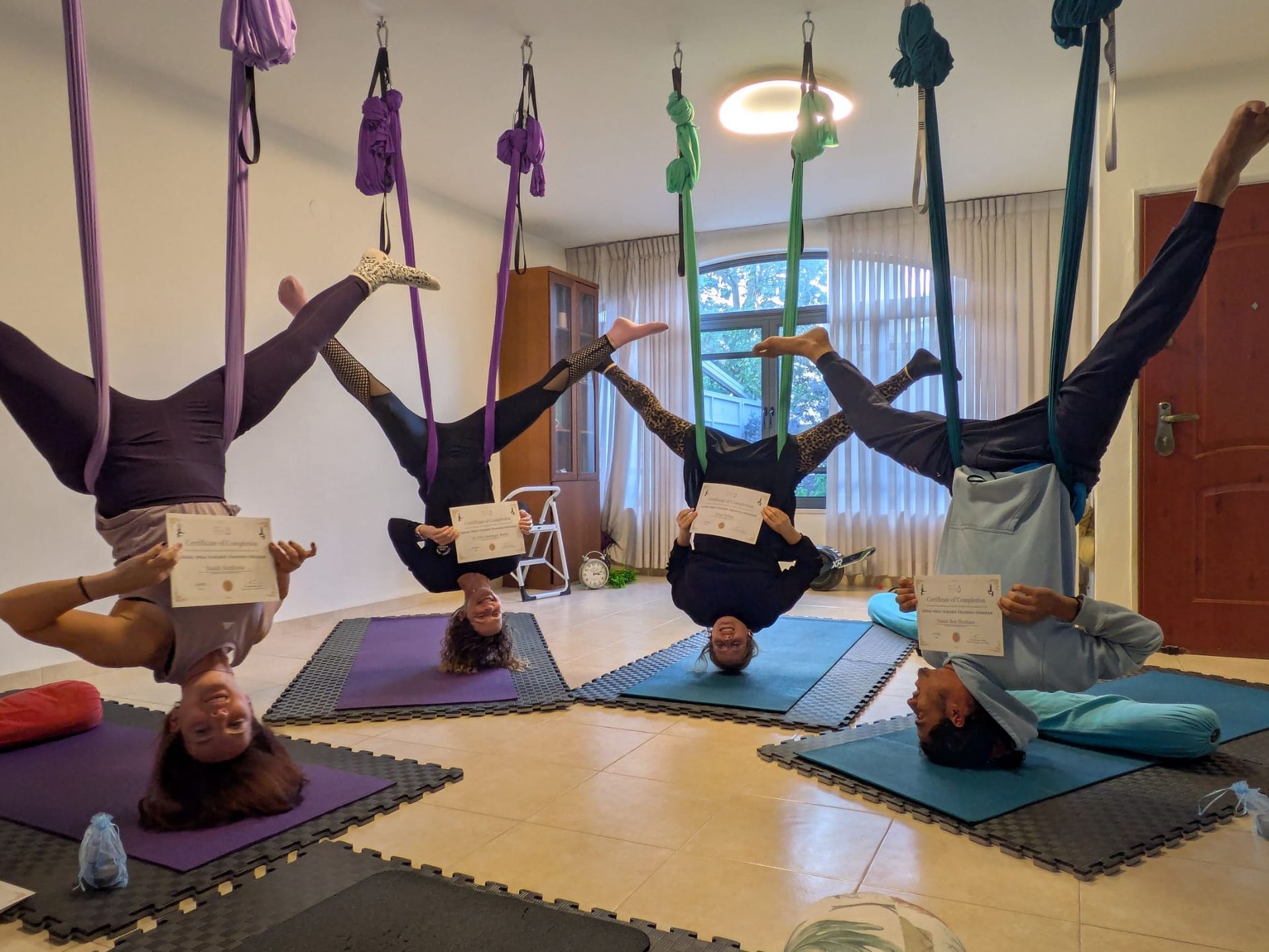 המחזור הראשון של הקורס הסתיים לפני כמה שבועות וחמישה מדריכים נהדרים ומוכשרים שסיימו את הקורס בהצלחה רבה, התחילו את דרכם בתחום הדרכת היוגה אווירית כשהם מצוידים בכל הידע והכלים המקצועיים שהם צריכים:)